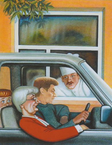 Grandma does some other strange things too. When we go to the drive-thru sandwich shop, Grandma says, "I want to pay for lunch." Then, she hands my father two postage stamps. Dad thanks her. When Grandma can't see, he pulls real money out of his pocket and hides the stamps. Dad winks at me. I say, "Thanks for lunch Grandma." |